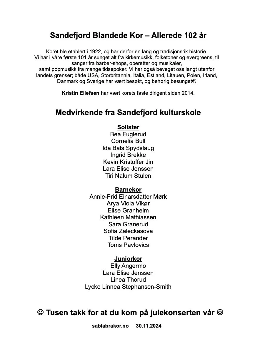 Lørdag 30. november inviterte vårt SaBla Bra Kor - tradisjonen tro - til en spennende førjulskonsert i vakre og klangfulle Sandefjord kirke.