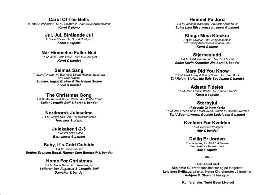 Vi framførte kjente og kjære sanger som passer godt i førjulstida. Vi var også så heldige å ha med oss ca 20 unge elever fra Sandefjord kulturskole. Sangene ble framført dels a cappella, dels akkompagnert av vårt fantastiske “husband”. Programmet er gjengitt nedenfor.